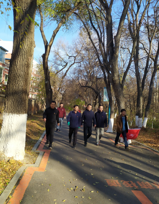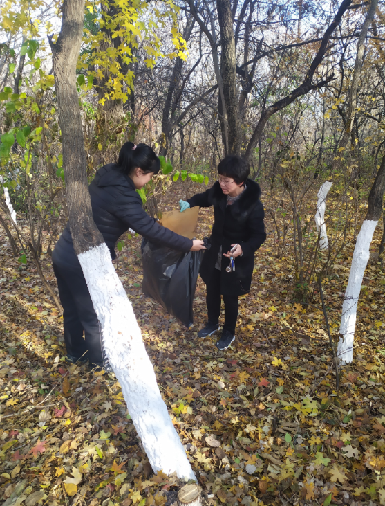 西区林园入口”进行徒步,并对徒步沿线的白色垃圾、枯枝、破损塑料布等各种垃圾进行环保清理。志愿服务现场,学院教职工分工明确,齐心协力,干劲十足。