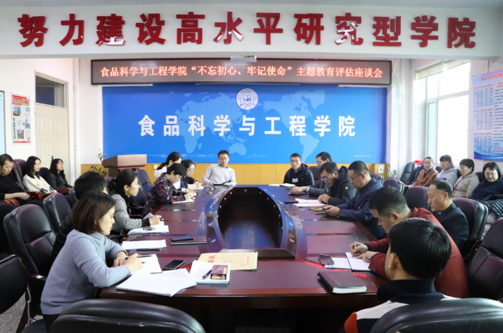 在食品楼三楼会议室召开了“不忘初心、牢记使命”主题教育评估座谈会.学院领导班子成员、党委委员、纪委委员、党支部书记、各系、办、中心主任、教师代表及学生代表等30余人参加了会议。学校主题教育第五指导组组长刘雪峰同志莅临指导并主持会议。