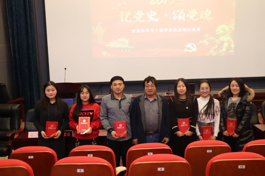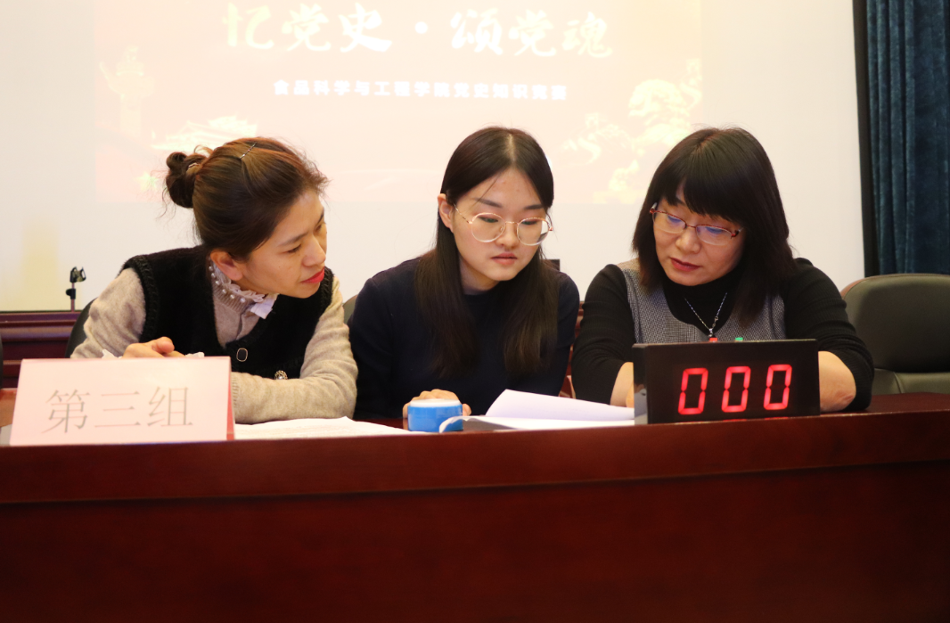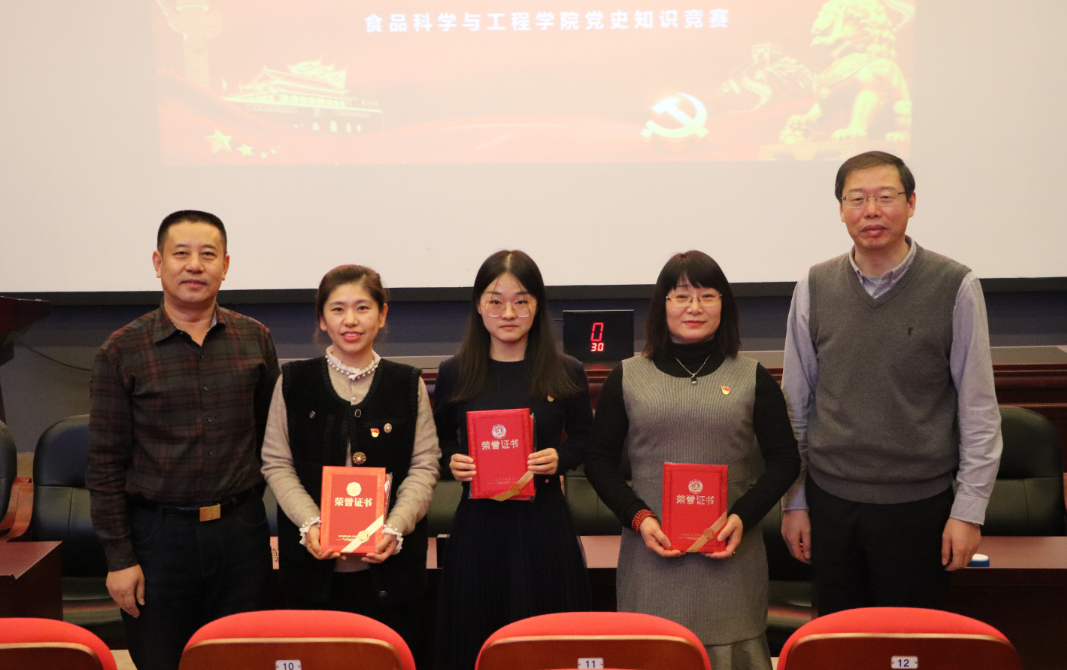 全体师生齐唱《中华人民共和国国歌》,拉开了竞赛帷幕。本次“忆党史 颂党魂”党史知识竞赛由学院师生党员联合组成的五支代表队参赛,知识竞赛由必答题、抢答题和风险题等环节,内容涵盖《中国共产党章程》《党的十九大报告》以及党史等相关内容。比赛中,选手们精神饱满,积极踊跃,沉着应答,展现出丰富的党史知识储备。在抢答题环节,各参赛队分秒必争,精彩迭出,赢得了与会师生的热烈掌声。比赛现场气氛热烈、紧张有序、扣人心弦,经过激烈角逐,食品科学与工程系第二教师党支部代表队荣获一等奖,实验教学中心党支部代表队荣获二等奖,食品科学与工程系第二教师党支部代表队荣获三等奖,机关党支部代表队和食品质量与安全系教师党支部代表队荣获优秀奖。