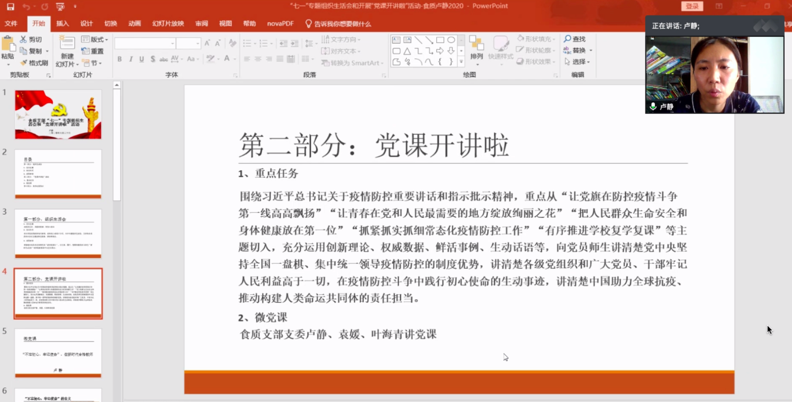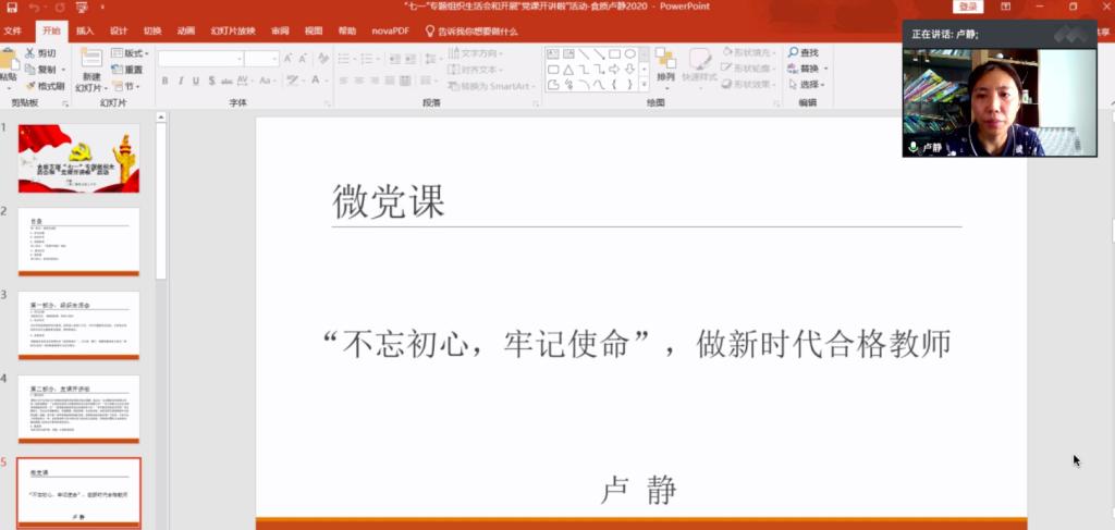 其次,支部支委委员卢静、袁媛、叶海青同志分别以“不忘初心牢记使命,做新时代合格教师“、“关于师德与学风建设的一点思考”、“沉默的英雄-记食品质量与安全系主任袁媛”为题讲授一堂专题微党课。党课受到高福和书记充分肯定,他说每个教师都蕴含无限潜能,这次会议让他深有感触,感动于每个人真实的故事和真情讲述,感动于我们优秀的党员和教师们线上教学的辛勤付出。作为党员,在纪念党99岁生日时,更应进一步牢记初心和使命,强化党性意识,在工作中进一步增强政治意识、政治纪律、政治观念,真正让党旗在我们心中和战疫一线高高飘扬、在推进学院建设中高高飘扬,让青春在在推进学院建设中绽放绚丽之花。