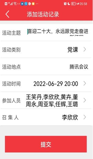 本次党课的主题是"喜迎二十大,永远跟党走,奋进新征程"。党课的内容是入党誓词的历史。李书记从入党誓词的五个阶段来讲解不同阶段赋予誓词不同的涵义,同时也映射出中国共产党艰难的发展历程和国家发展的不同阶段的现状,对入党人员的要求不同,导致入党誓词的内容有所差异,根据当时共产党的发展需要进行不断的修改,使之更加符合中国共产党的发展要求。入党誓词的历史分为红军时期丶抗日战争时期,解放战争时期,建国初期和十二大以后五个阶段。我们现在使用的誓词是十二大以后确定的誓词。