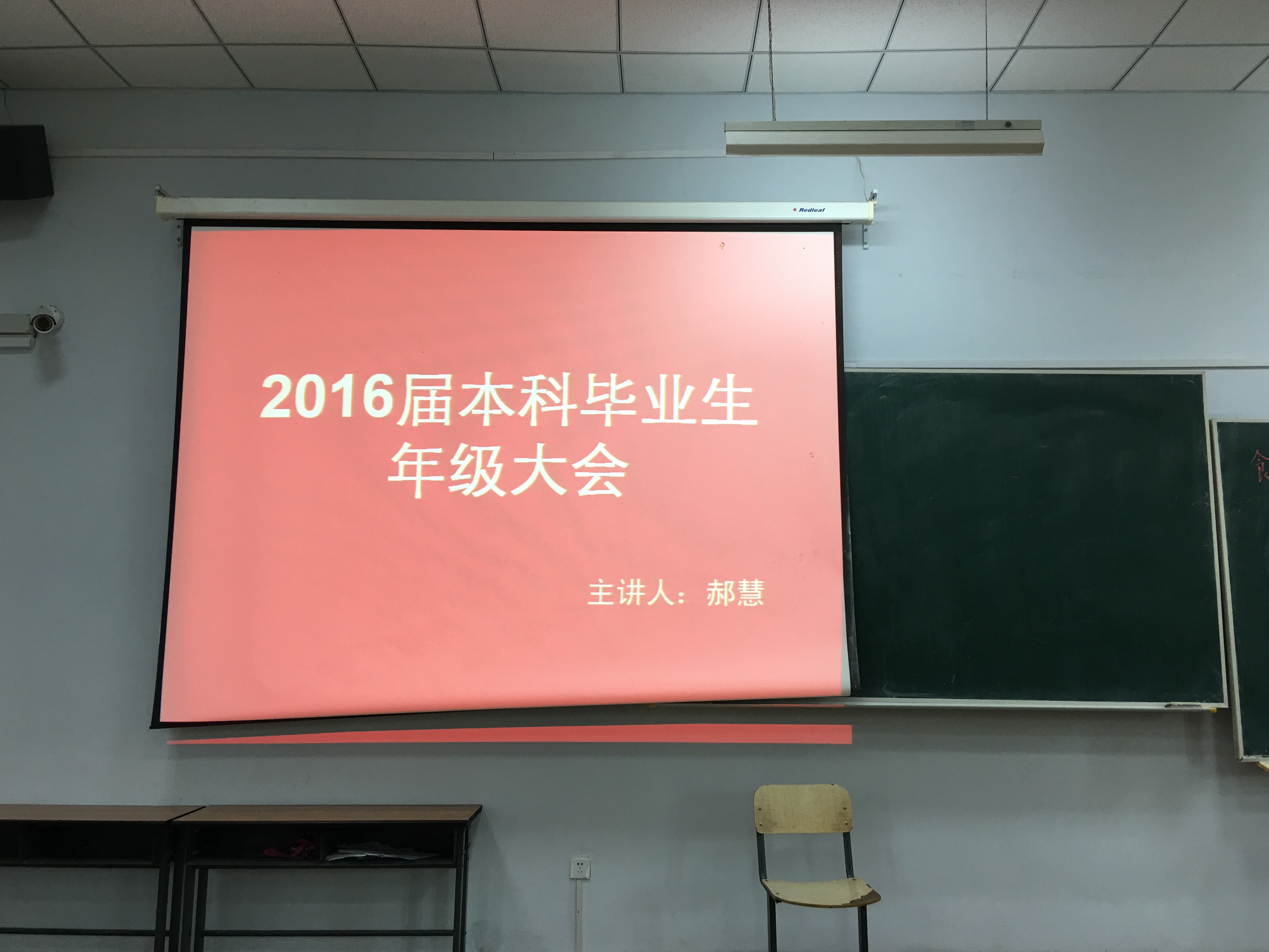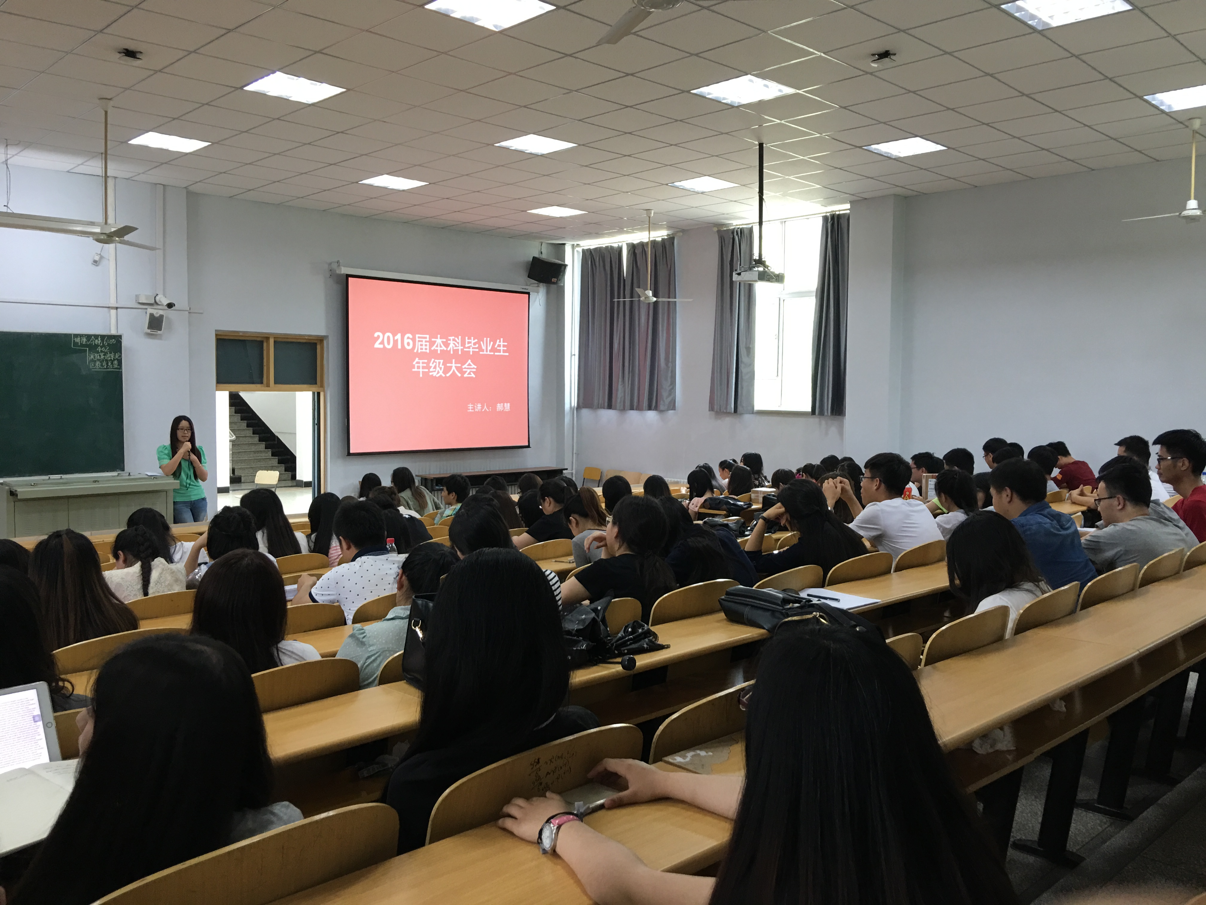 以及军需科技学院本科毕业生齐聚一堂,于科学讲堂200教室热烈召开毕业生年级大会。本次会议由2012级辅导老师郝慧老师主持。 会议初始,郝慧老师向各位同学传达了关于毕业的相关事宜,包括毕业生档案的整理和档案地址确认、派遣证的核对和发放、户口的迁移落户、毕业证和学位证的发放、党员关系的转移、毕业典礼的召开以及离校手续的办理等等。教导同学们一定要做好毕业前的各项工作,及时关注院系动态和新通知,以免错过重要的通知。另外,郝慧老师还嘱咐每一名学生,几点需要特别注意的事项:第一,毕业在即,同学们在欢聚和告别的同时,一定要谨记安全第一。第二,在六月下旬会有许多重要的毕业相关事项,希望同学们不要离开学校以免给毕业带来麻烦。 紧接着,由2012级各班班长和团支书依次上台发表毕业感言,各位班长以及团支部书记都发表了真挚热烈的发言,对学院领导和老师表达了感激之情,对辅导员郝慧老师表达了最真诚的感谢,对与他们朝夕相处四年的同学们进行了美好的祝愿。 会议的最后,郝慧老师与所有的同学合影留念,殷切的希望同学们能够顺利度过在校的宝贵时光,祝福所有2016届本科毕业生一帆风顺,前程似锦!