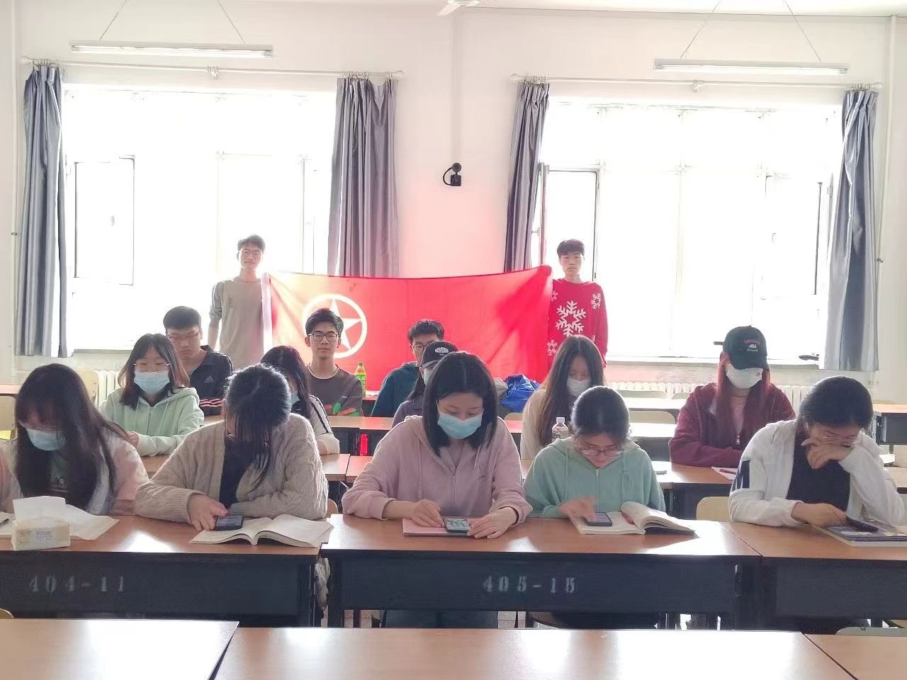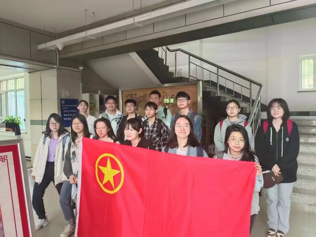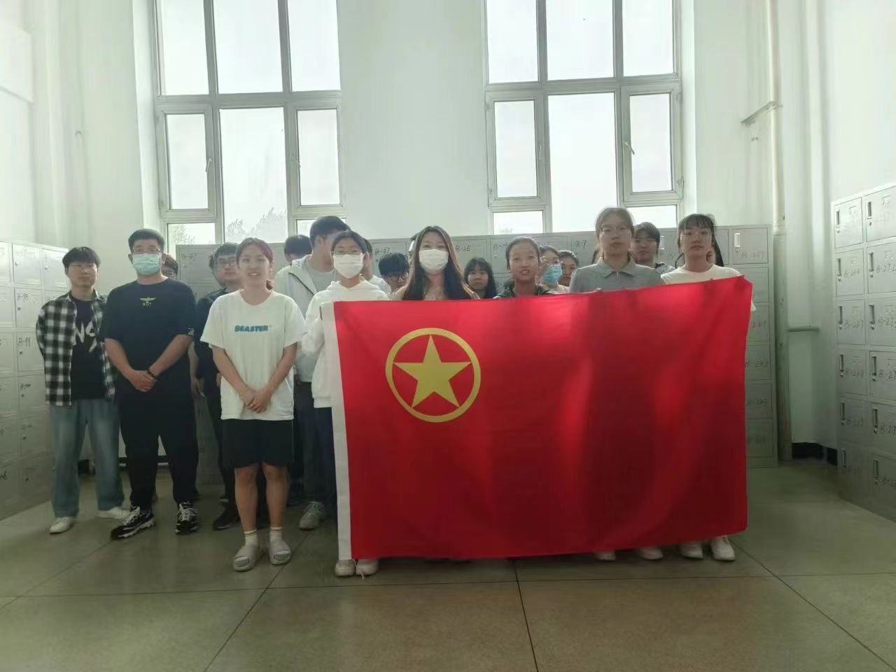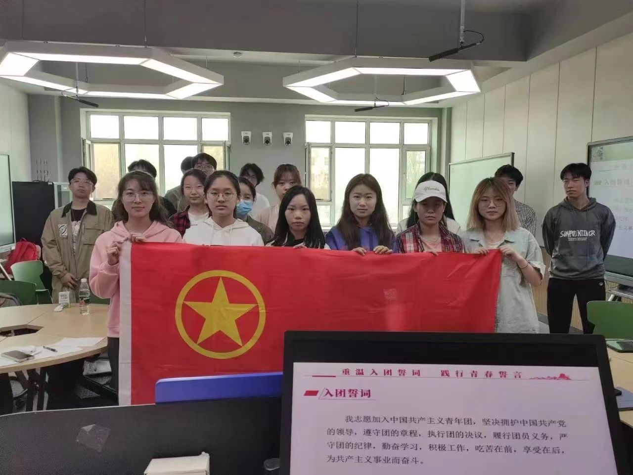 21级5班团支部于科学大讲堂组织开展了“我与团旗合个影”主题团日活动。活动中,同学们纷纷站到离团旗最近的地方,感受团旗的神圣。本次活动激发了同学们对共青团员身份的认同感和荣誉感,更体会到了自身的责任感。