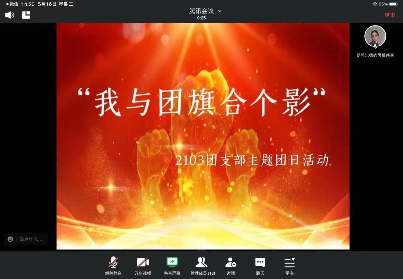 2103团支部于2023年5月16日下午开展“我与团旗合个影”主题团日活动,支部13位团员与一名青年参与此次活动。