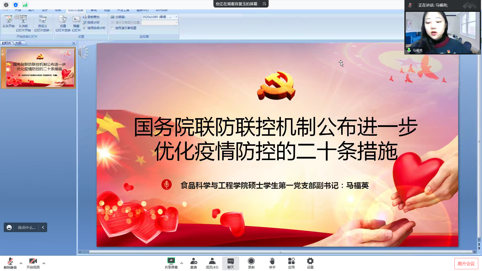 紧接着,由支部副书记马福英带领与会人员集体学习国务院公布的“进一步优化疫情防控工作二十条措施”内容。马福英同志指出,二十条优化措施充分彰显了“坚持人民至上、生命至上”的疫情防控指导思想,是统筹疫情防控和经济社会发展的重大积极成果。与此同时,各位党员同志要充分认识抗疫斗争的复杂性、艰巨性、反复性,坚定不移贯彻“动态清零”总方针,积极配合学校相关防疫工作安排,积极参与学校防疫志愿工作,发挥党员先锋模范作用。