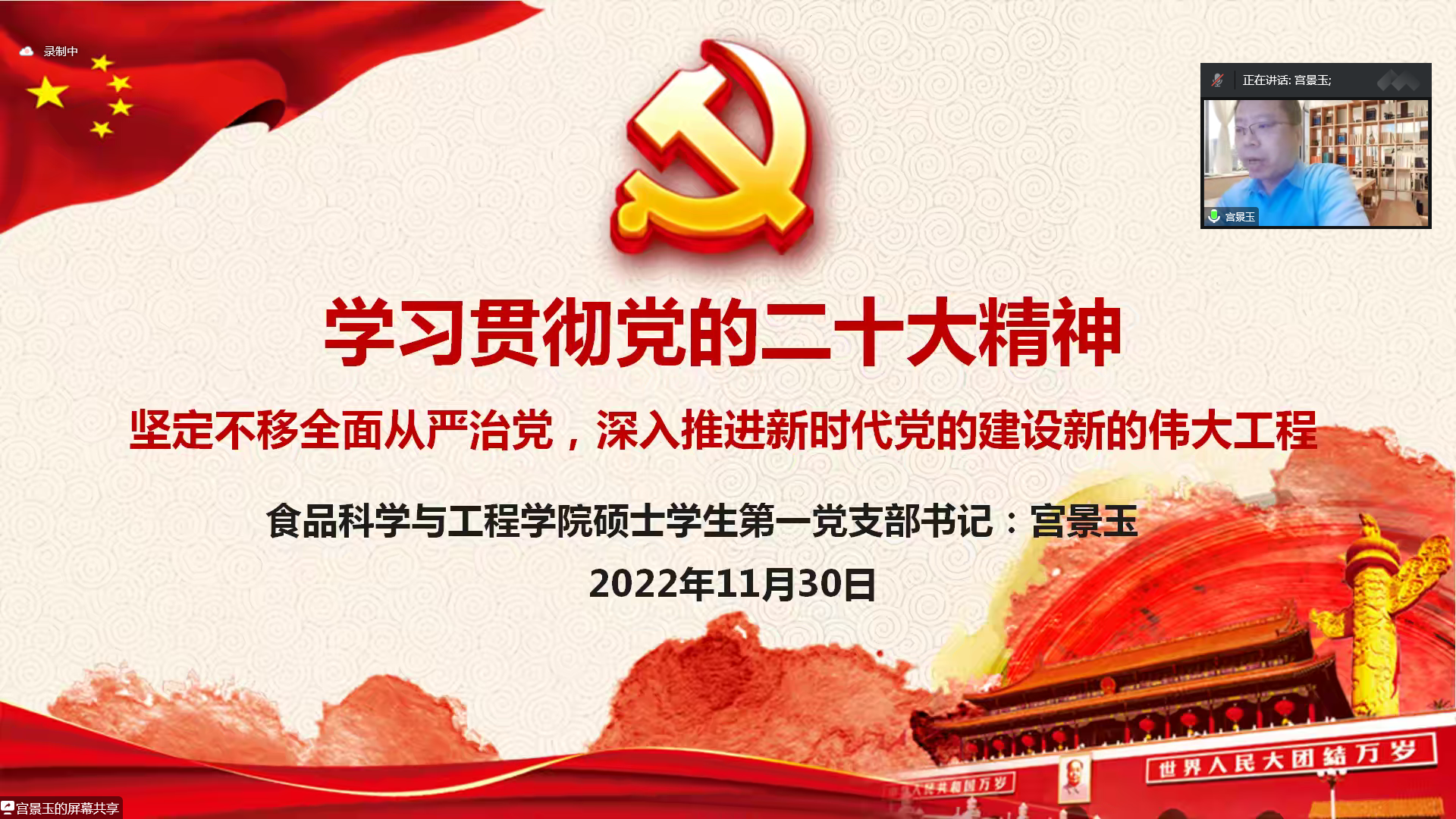 为深入学习宣传贯彻党的二十大精神,全面贯彻习近平新时代中国特色社会主义思想,坚定不移推进全面从严治党。2022年11月30日下午,色情论坛 硕士学生第一党支部通过腾讯会议召开十一月主题党日活动。支部全体党员参加,会议由支部书记宫景玉主持。